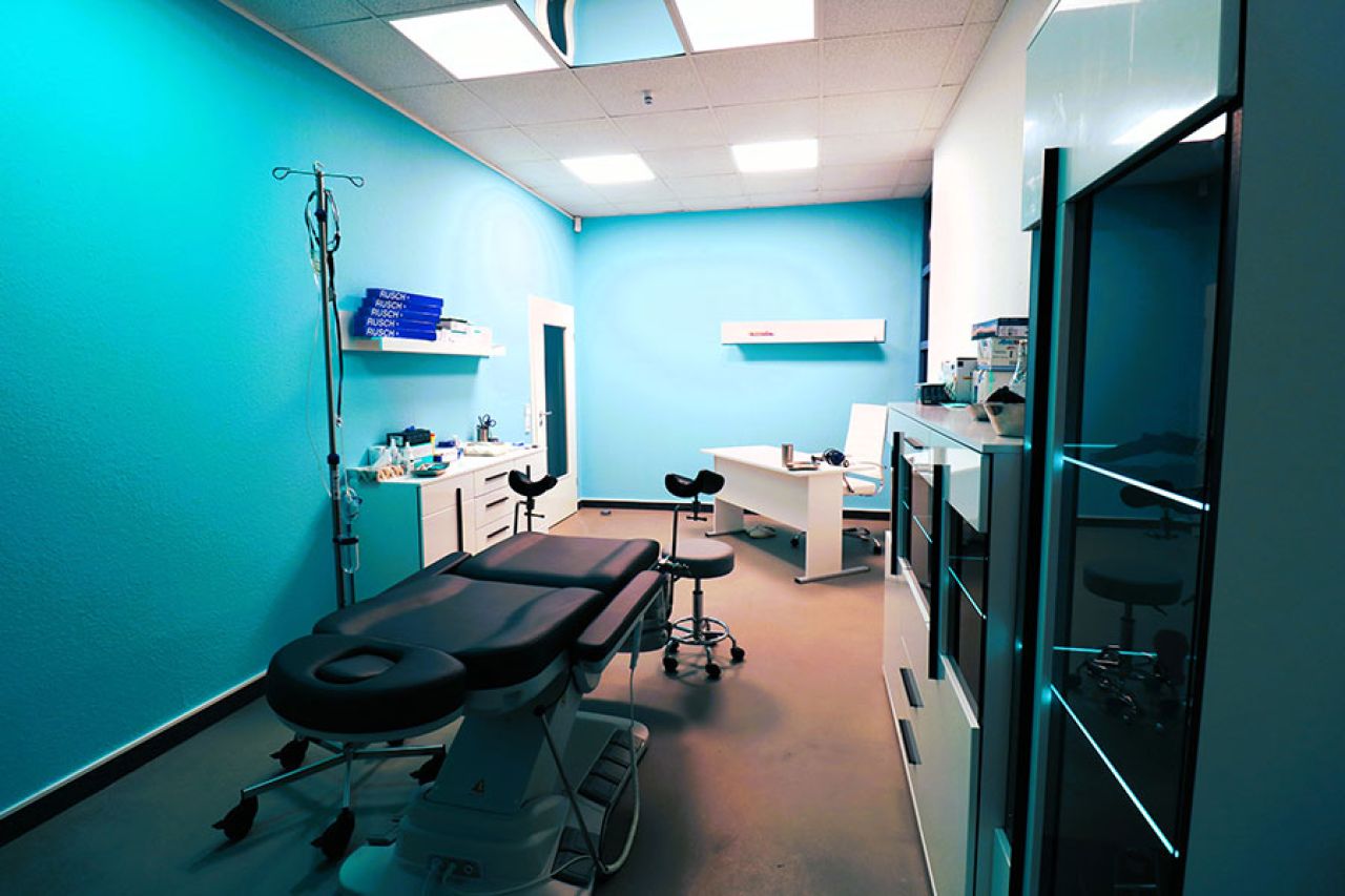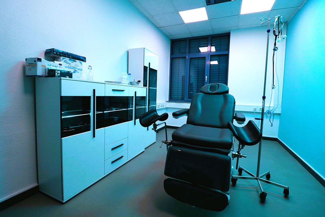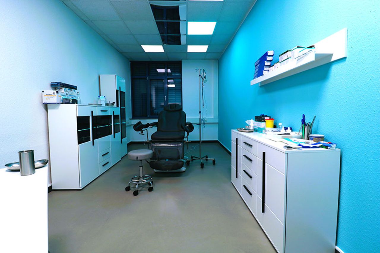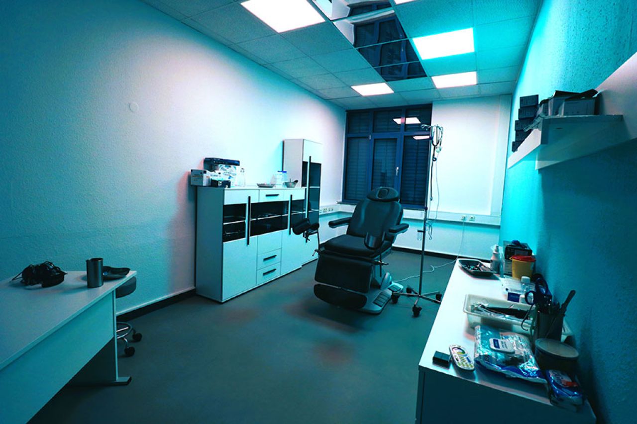 Die 22 qm große Klinik ist ein Ort, der jeden Klinik-Fetischisten durch ihre moderne Einrichtung mit Lack weißen beleuchteten Möbeln mit Glas-Vitrinen und großem Behandlungsstuhl schon bei der ersten Sekunde begeistern und keine Wünsche offenlassen. Die Farbgestaltung mit weiß- und mintfarbenen Wänden schaffen sowohl eine echte Arzt-Praxis- als auch Krankenhaus-Atmosphäre.