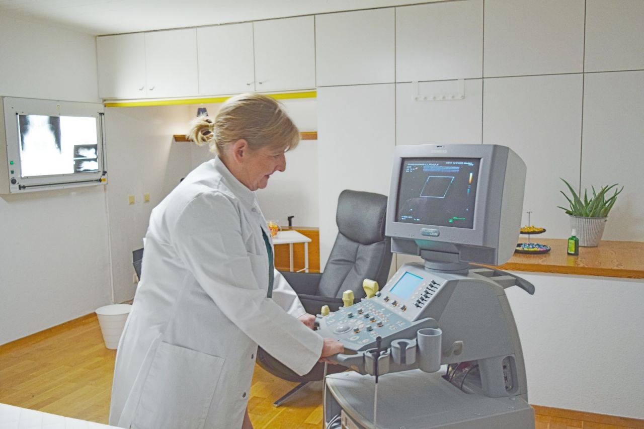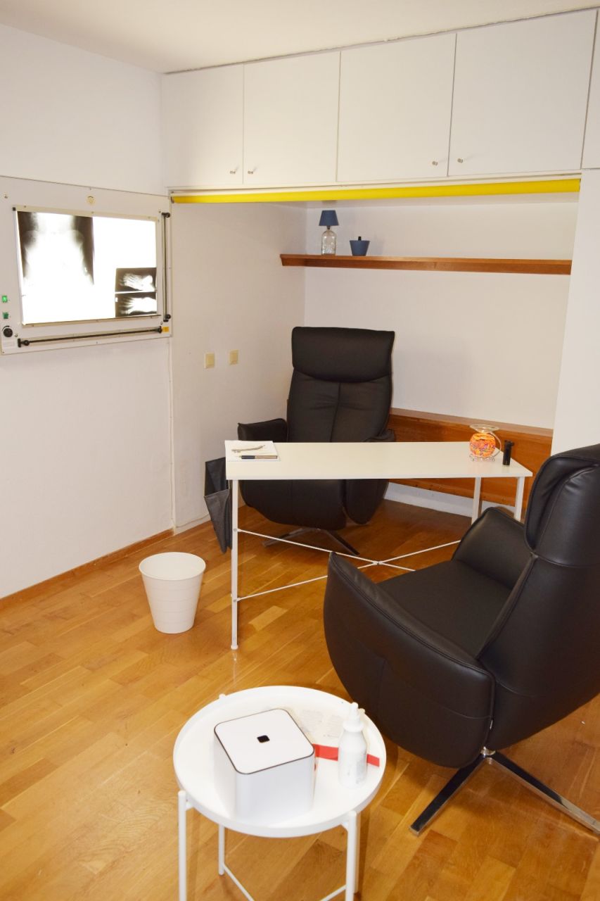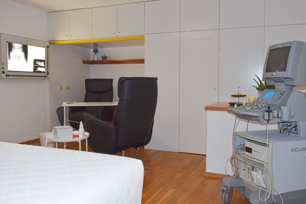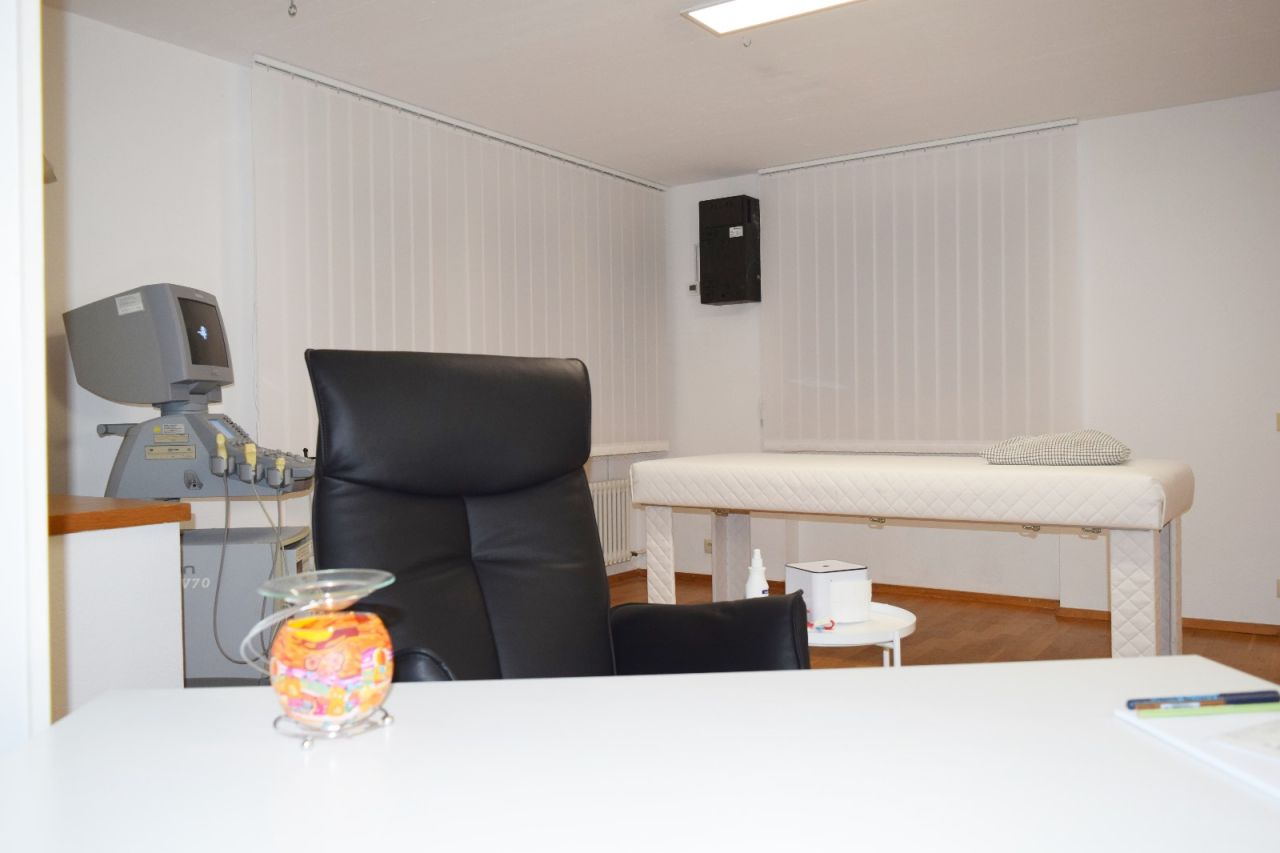 Im Besprechungszimmer, werden wir als Erstes eine ausführliche Anamnese durchführen, um dann den Behandlungsablauf festzulegen. Hier im Raum befindet sich eine extra breite Untersuchungsliege und Ultraschallgerät der Fa. Siemens, damit ich eine gründliche Untersuchung zur Diagnosestellung machen kann.